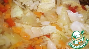 Помыть, почистить и нарезать морковь, картофель, капусту, болгарский перец. И закинуть всё по мере нарезания в кипящий бульон. Немного посолить. -