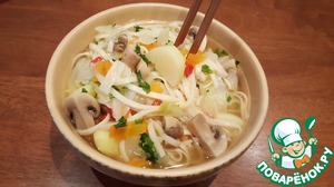 Добавить в кастрюлю с супом лапшу удон. Если не собираетесь скушать весь суп сразу, сварите лапшу отдельно, согласно инструкции на упаковке, и добавляйте непосредственно в тарелки. Т. к. у меня порция была рассчитана на 1 раз, я добавила лапшу в кастрюлю и варила 8 минут.