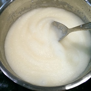 В 1,5 стакана кипящей воды добавляем 5 столовых ложек манной крупы, постоянно помешивая, варим несколько минут обычную манную кашу. Оставляем остывать. -