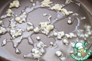 Помидоры мелко порезать. Разогреть на сковороде растительное масло и обжарить на нем в течение минуты мелко рубленный чеснок.