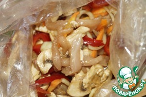 Подготовленные куриное филе, грибы и овощи выложить в пекет для запекания, залить подготовленным маринадом и дать настояться около 30 минут. Затем пакет для запекания завязываем и запекаем в духовке при температуре 180 гр около 30-35 минут. -