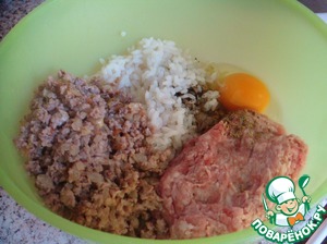 Рис отварить до готовности, откинуть на дуршлаг, промыть и дать воде полностью стечь. Смешать обжаренный фарш с сырым фаршем и отварным рисом. Добавить 1 яйцо, вымешать. Посолить, поперчить, добавить кумин и тимьян по вкусу.