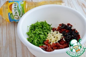 Пока бродит тесто подготовить добавки: маслины порезать, томаты порезать, чеснок 3 зубчика мелко порубить, зелень порубить. Все смешать. Зелень здесь может быть любая... у меня: укроп, петрушка, шпинат. Также и добавки могут быть любые на Ваш вкус.