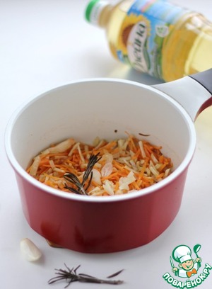 В толстостенной кастрюле разогреть растительное масло "Олейна", всыпать щепотку зиры, положить веточку розмарина, обжарить 1 минуту. Всыпать нарезанный лук, раздавленный плоской стороной ножа и измельченный чеснок, пассеровать пару минут, добавить морковь, сельдерей, жарить минуты 2-3.