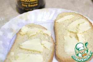 Обжариваем наш фарш, и пока он жарится, подготовим основу для бутербродов. Одну сторону 2х кусочков батона намазать тонким слоем сливочного масла.