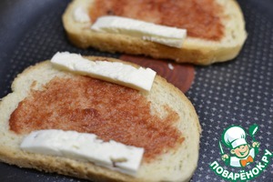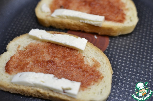На сковороду укладываем целые кусочки батона маслом вниз. Мажем кетчупом, по бокам кладем тоненькие брусочки брынзы (можно по всему периметру)