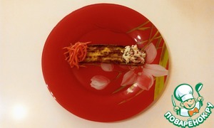 На кабачок кладем с одного края чайную ложку рисовой начинки, а на другой край морковь по-корейски.