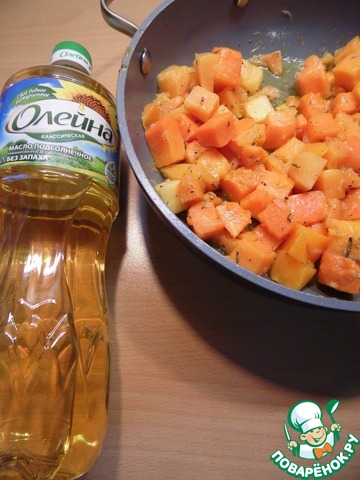 Чеснок измельчить, тыкву нарезать небольшими кубиками. Подготовленные овощи обжарить на растительном масле ТМ "Олейна" 10-15 минут. Посолить, поперчить, приправить розмарином. Тушить еще 5 минут.