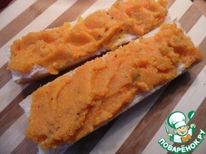 Багет разрезать вдоль, намазать на обе части тыквенное пюре.