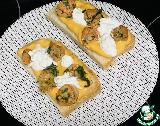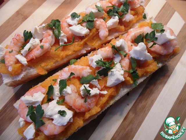 Рецепт «Брускетта с тыквенным пюре и креветками»:
