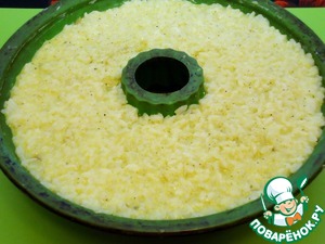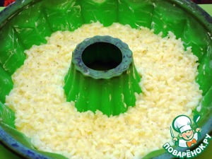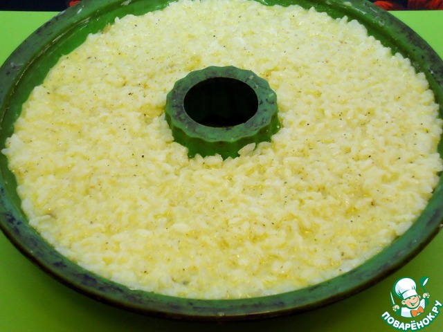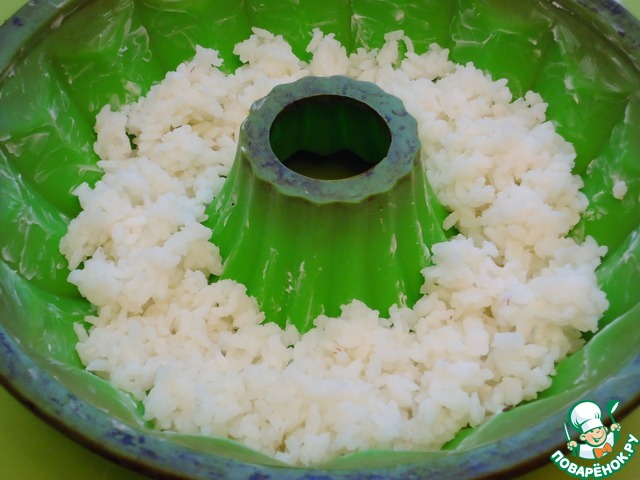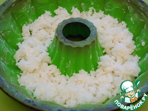 Поливаем рис в формочке получившейся яичной заливкой.