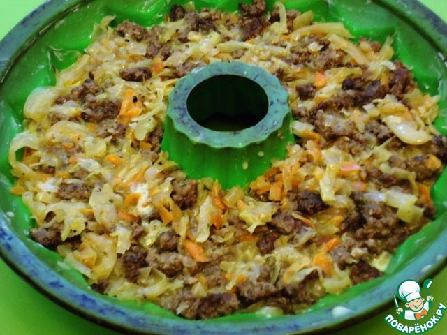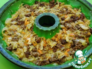 Сверху риса выкладываем фарш с капустой. Его тоже поливаем яичной заливкой.