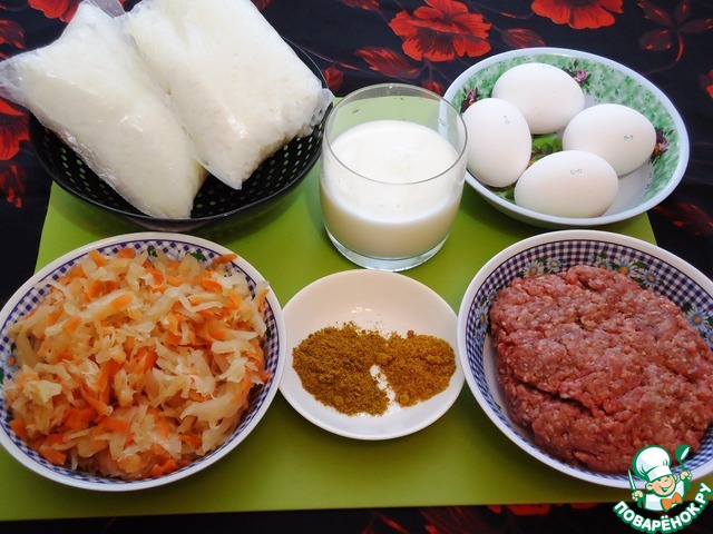 Фарш использую говяжий. Рис два пакетика по 100 г отвариваю с утра, пока собираюсь на работу. Капуста квашеная своя, не сладкая.