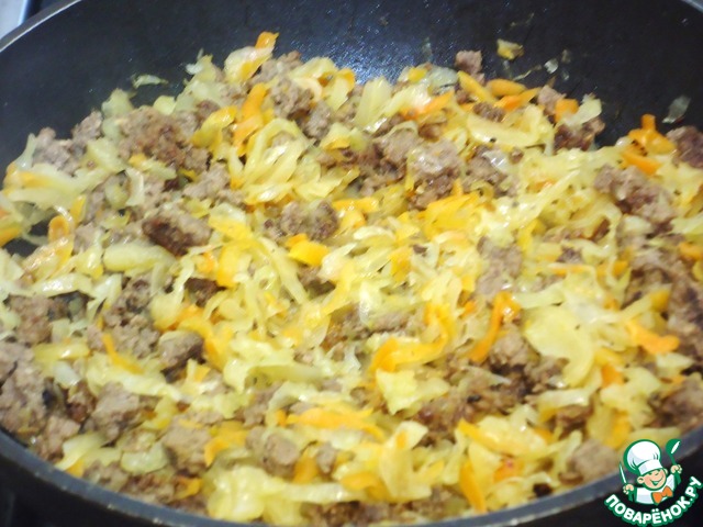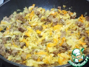 Фарш обжариваю пять минут на растительном масле. Капусту еще мельче шинкую и тушу вместе с фаршем еще 10 минут.