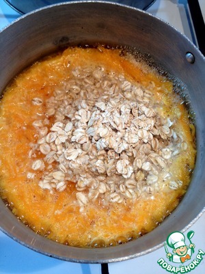 В кипящую воду всыпать овсяные хлопья, сахар, изюм и тыкву, перемешать и варить на медленном огне 15 минут.