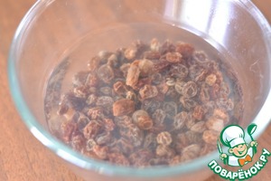 Изюм слить и немножко нарезать на меньшие кусочки.