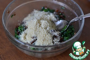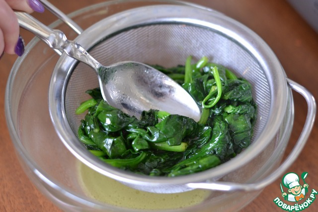 Откинуть шпинат на дуршлаг, не перетирать, только подождать, когда стечет вода. -