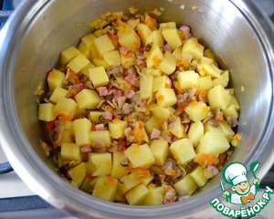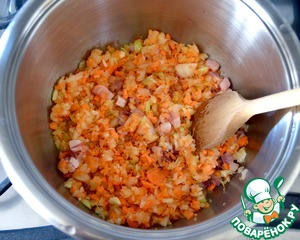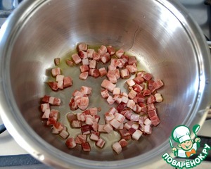 Овощи очистить и нарезать помельче. Можно немного измельчить их с помощью кухонного комбайна. Бекон нарезать кубиками. Картофель также очистить и нарезать небольшими кубиками. В кастрюле разогреть 2 ст. л. растительного масла и обжарить бекон 1 минуту.