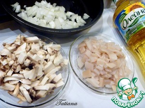 Приготовьте гречку, согласно указаниям на упаковке. Лук, грибы и кальмары, нарежьте мелким кубиком. Подготовленные продукты поочередно обжарьте на подсолнечном масле, посолите, поперчите.
