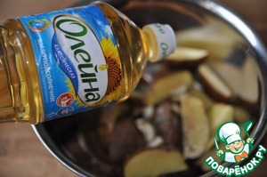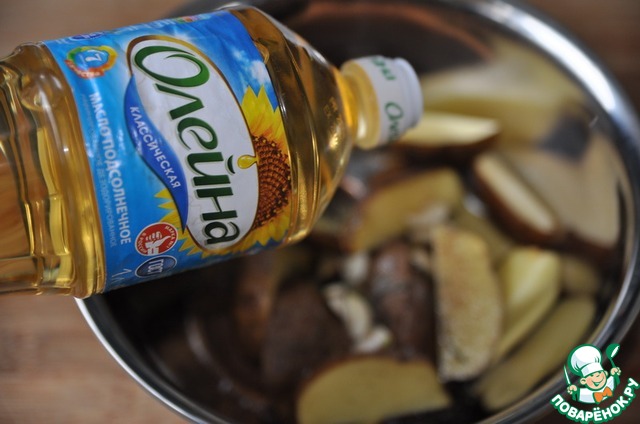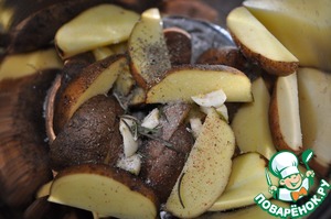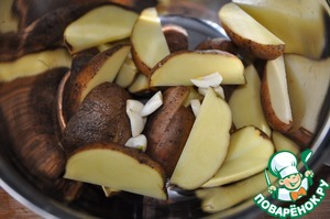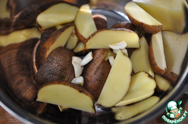 Режем картофель дольками, кладём в миску, добавляем порезанные пополам зубчики чеснока.