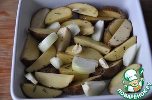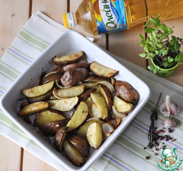 Кладём картофель в удобную для запекания форму, между картофелинами кладём дольки репчатого лука, ставим в нагретую до 200 градусов духовку и запекаем 40 минут.