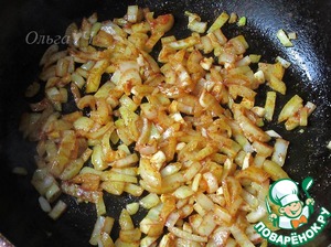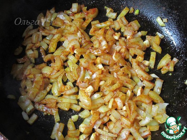 Обжарить мелко нарезанный лук с паприкой, перцем и чесноком.