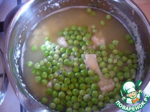 Капусту и горошек залить водой (количество воды зависит от степени желаемой густоты супа). Довести до кипения и варить до готовности на среднем огне (минуты 4-5)