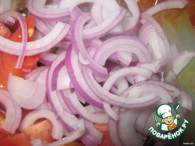Лук так же нарезать полукольцами.