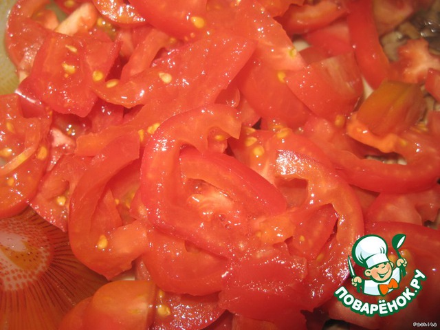 Помидорки нарезать полукольцами.