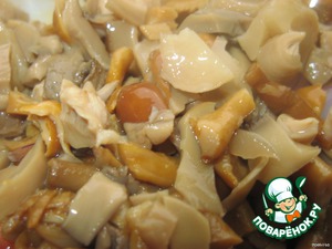 - Грибы (шампиньоны свежие 100 гр., грузди, опята, маслята соленые 150 гр.) — 250 г