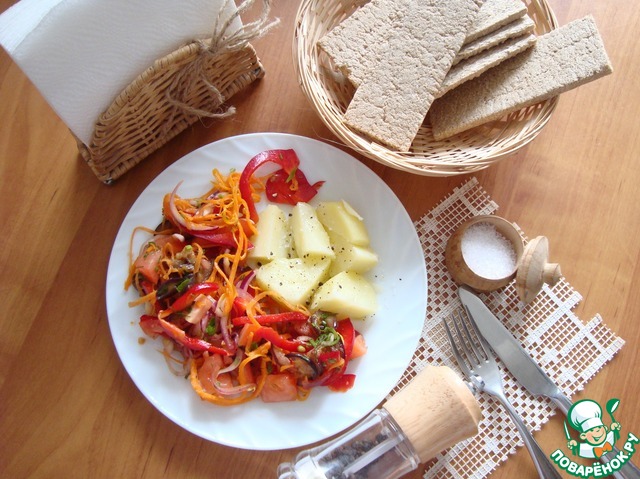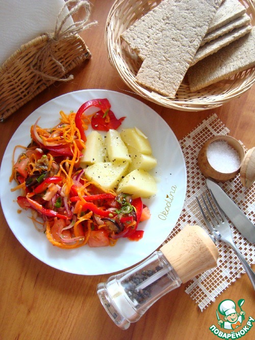 Для подачи тёплый картофель чистим, присыпаем солью по вкусу, перчим по желанию и поливаем подсолнечным маслом, выкладываем к нему салат.