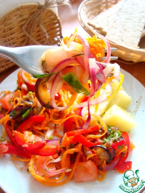 Салат с баклажанами и овощами, с маринованным красным луком в лайме с сахаром. Подала с тёплым, молодым картофелем, сваренным в мундире.