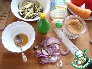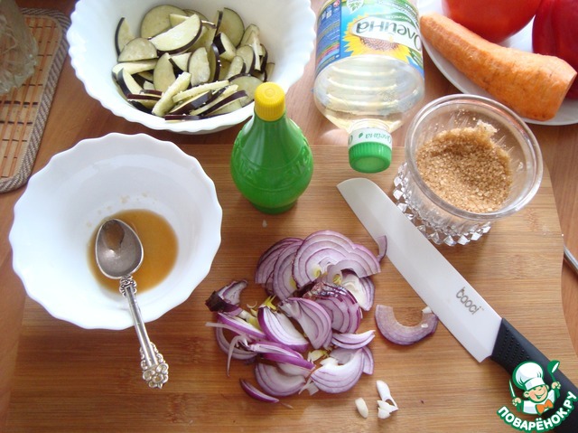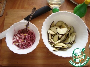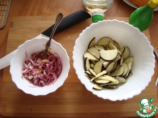 Берём посуду и выкладываем дольки баклажана в неё, присыпаем солью и отставляем в сторону, чтобы дольки дали сок и ушла из них горечь. Лук красный нарезаем тонко полу-кольцами и выкладываем его мариноваться в сок лайма, соединённый с сахаром.