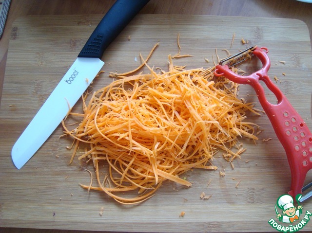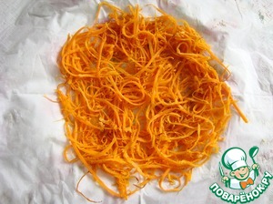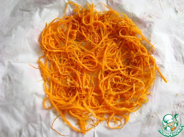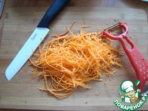 Морковь натираем корейской тёркой длинной "лапшой". Так красивее смотрится она в салате.