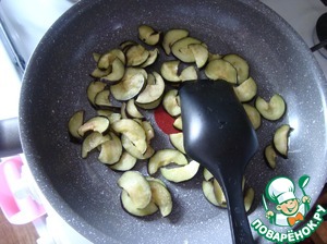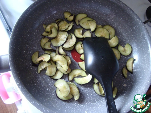 Выкладываем в масло отжатые баклажаны от выделенного сока. Жарим баклажаны до готовности.
