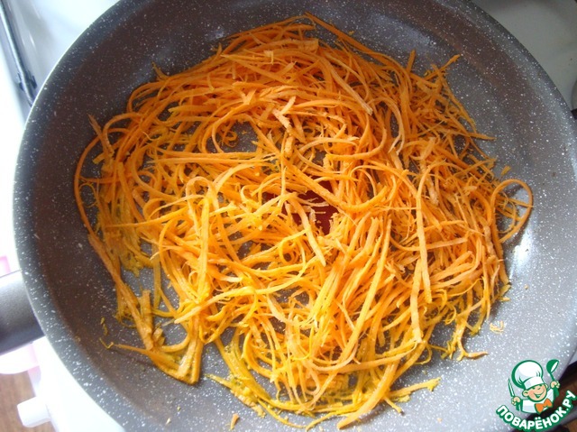 В сковороду масла подливаем ещё и выкладываем морковь. Чуть обжариваем её-не до мягкости.