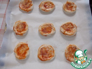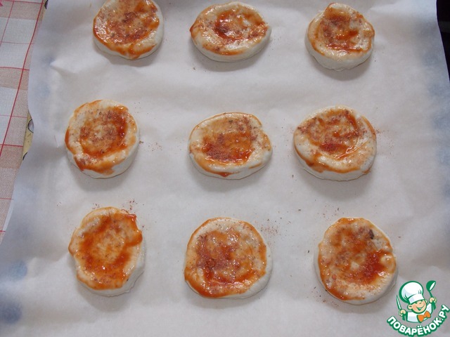 Вырезать кружочки, выложить на противень с пергаментом, серединки немного прижать дном стакана. -