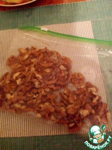 Орехи просушить в микроволновке или духовке несколько минут, и измельчить скалкой, так чтоб были кусочки. И разделить пополам.50 гр уйдет в начинку, а остальные 50 гр на посыпку.