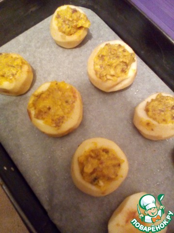 Берем форму, у меня раздвижная 30/20 см. Застелить пергаментом и смазать дно масло или растительным маслом. Выкладываем яблоки и серединки начиняем орехово-кремовой начинкой.