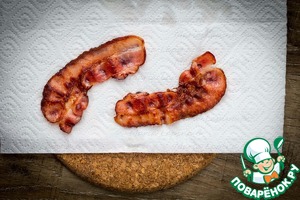 Для непостного варианта пожарить до румяности ломтики бекона на сухой сковороде и выложить на бумажное полотенце, чтобы убрать лишний жир.