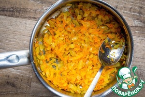 В сотейнике разогреть оливковое масло и обжарить лук до прозрачности. Добавить морковь и продолжать жарить 2-3 минуты. -