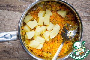 Картофель нарезать кубиком и добавить к обжаренным овощам. -