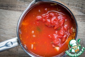 Влить томаты в собственном соку и воду. Довести до кипения, посолить, поперчить, добавить сахар (понемногу, так чтобы сбалансировать кислоту томатов). Уменьшить огонь и варить 30-40 минут.