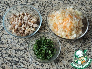 Капусту отжать от рассола (лучше брать не слишком кислую) и порубить. Куриное филе порезать мелкими кубиками. Покрошить петрушку.