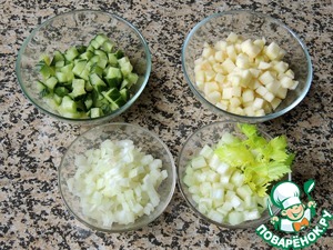 Такими же кубиками, как и курицу, порезать огурец, очищенное от кожуры и семенной коробочки яблоко, черешок сельдерея и лук.