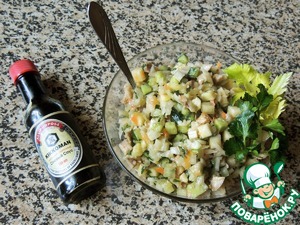 Смешать ингредиенты салата и заправку. Дать салату немного настояться в холодильнике.