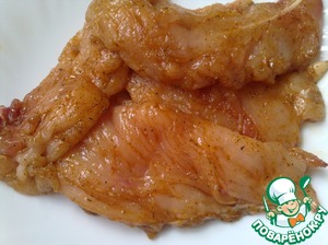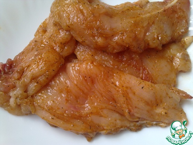 С куриной грудки срезаем тонкие пластинки филе, посыпаем любимыми приправами (черный молотый перец, паприка сладкая, карри).