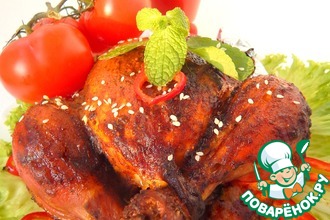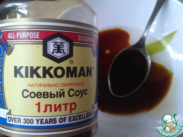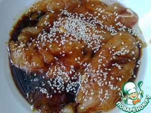 Приготовим маринад: соевый соус "Kikkoman" смешать с лимонным соком и кунжутным маслом, добавить семена кунжута, сахарную пудру.