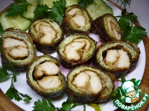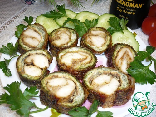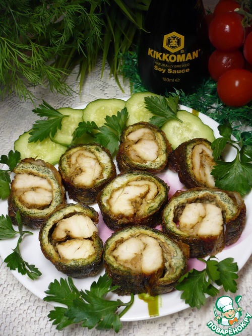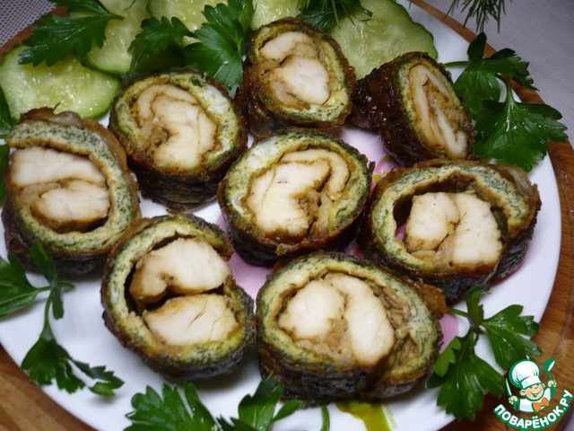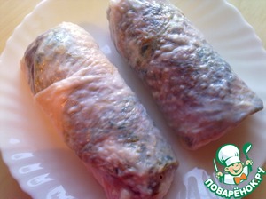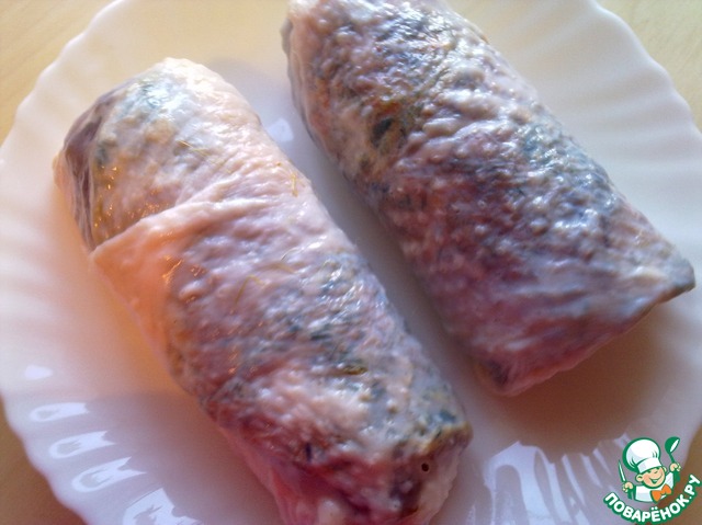 Заворачиваем в рулет таким же образом, как делаем фаршированные блины, только для надежности рулеты лучше обмотать ниткой, оставив длинные концы.