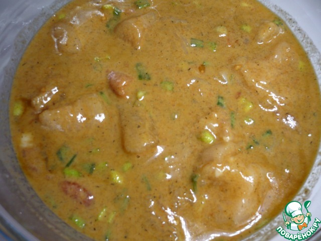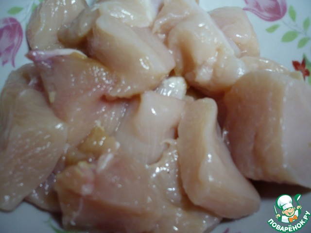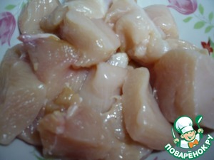 Выкладываем в маринад нарезанные кусочки куриного филе, хорошо перемешиваем, накрываем крышкой или затягиваем пищевой пленкой.